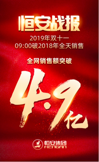 2019年双十一大促刚刚结束,恒安集团仅前9小时的销售额已超过去年全天双十一销售额,截止11号24点全网实现4.9亿元!